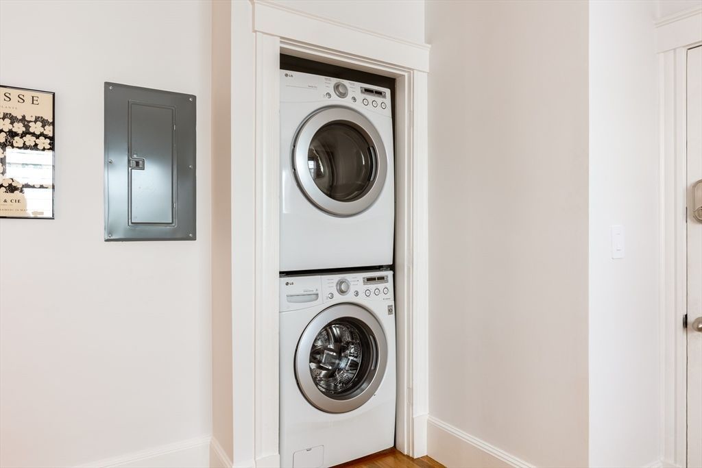 Beautiful light filled 1st floor 2 bedroom apartment with deeded parking spot. Large Main bedroom has an ensuite bathroom and a large closet. Second bedroom is separate and next to an additional bathroom. There are porches on the front and back of the building with enough room for chairs and a small table. This Unit was completely remodeled in 2012 and has stainless steel appliances, Hardwood floors, HVAC and in unit laundry. Conveniently located on a quiet side street in west Somerville. .3 miles to Tufts University, 1.3 miles to Davis Sq., .9 miles to Wholefoods Market, .8 Miles to Davis Sq T