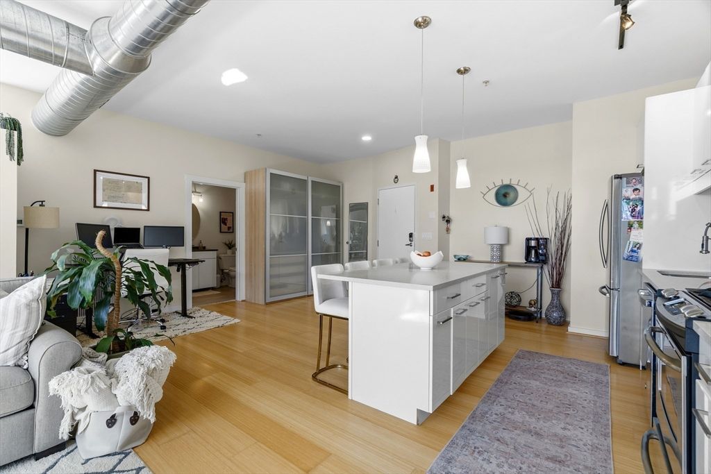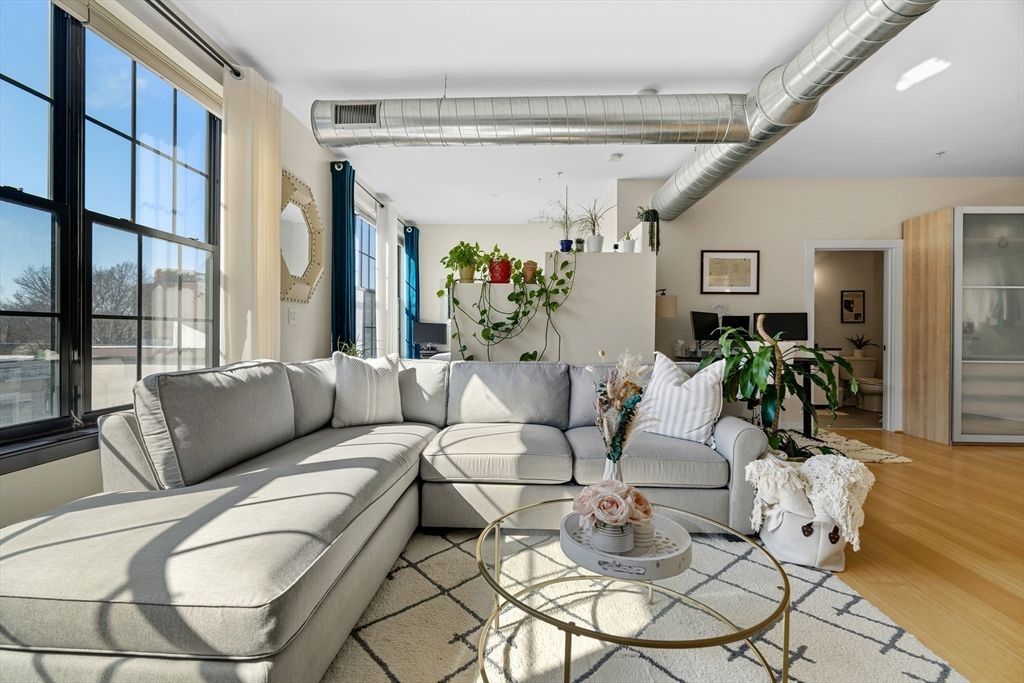 PH Loft Living W 1 Parking Spot Included! A bright top floor unit in the DNA loft building with vaulted ceilings, bamboo floors, factory size windows, kitchen with caesarstonecountertops, SS appliances and high gloss cabinets. Incredibly spacious renovated bathroom includes oversized tile shower and In-unit Washer/Dryer. Relax in thelandscaped courtyard or large common Roof deck with amazing views of the city skyline and harbor. Underground garage parking with storage space and aGym on the lower level. A short walk to both JFK and Savin Hill red line stops.
